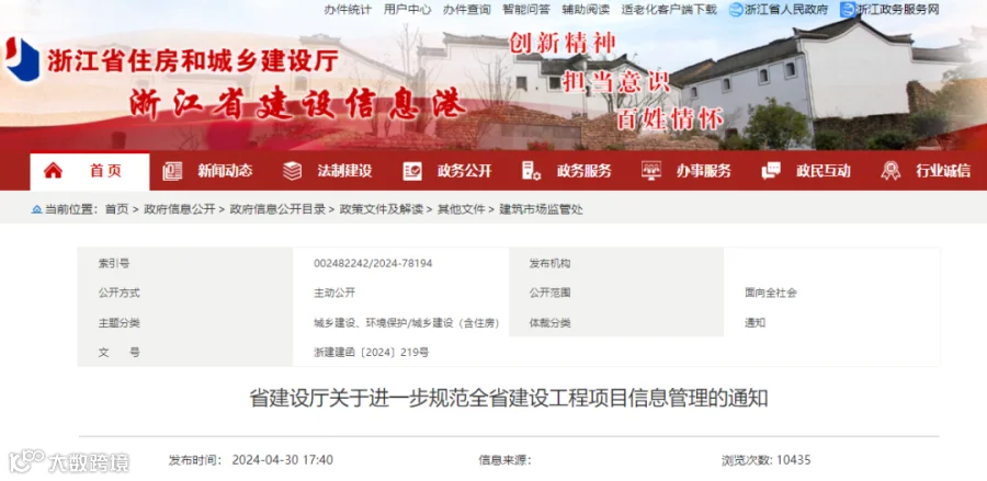 4月30日,浙江省住建厅发布《省建设厅关于进一步规范全省建设工程项目信息管理的通知》。本通知自印发之日起执行,原有规定与本通知不一致的,以本通知为准。