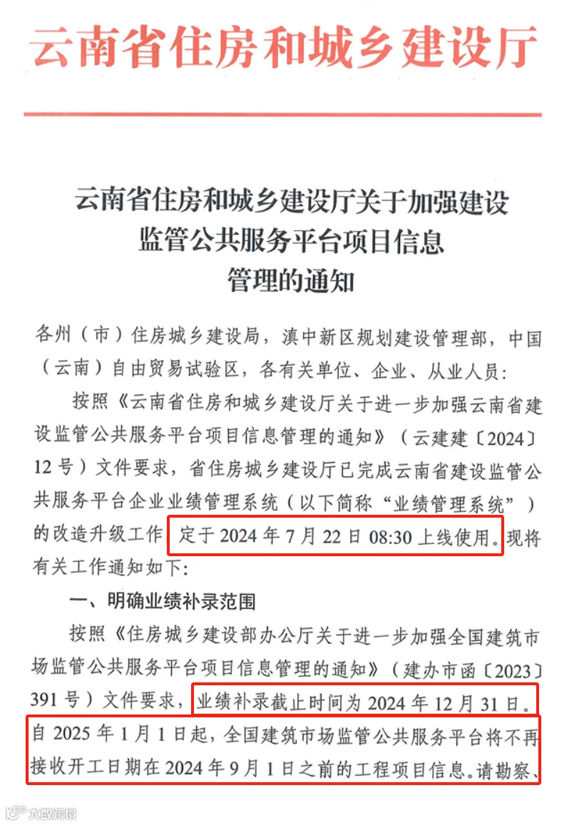 云南省建设监管公共服务平台企业业绩管理系统定于2024年7月22日08:30上线使用。