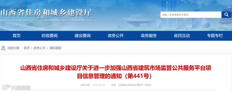 此前4月,山西省住建厅发布《关于进一步加强山西省建筑市场监管公共服务平台项目信息管理的通知》(第441号)。