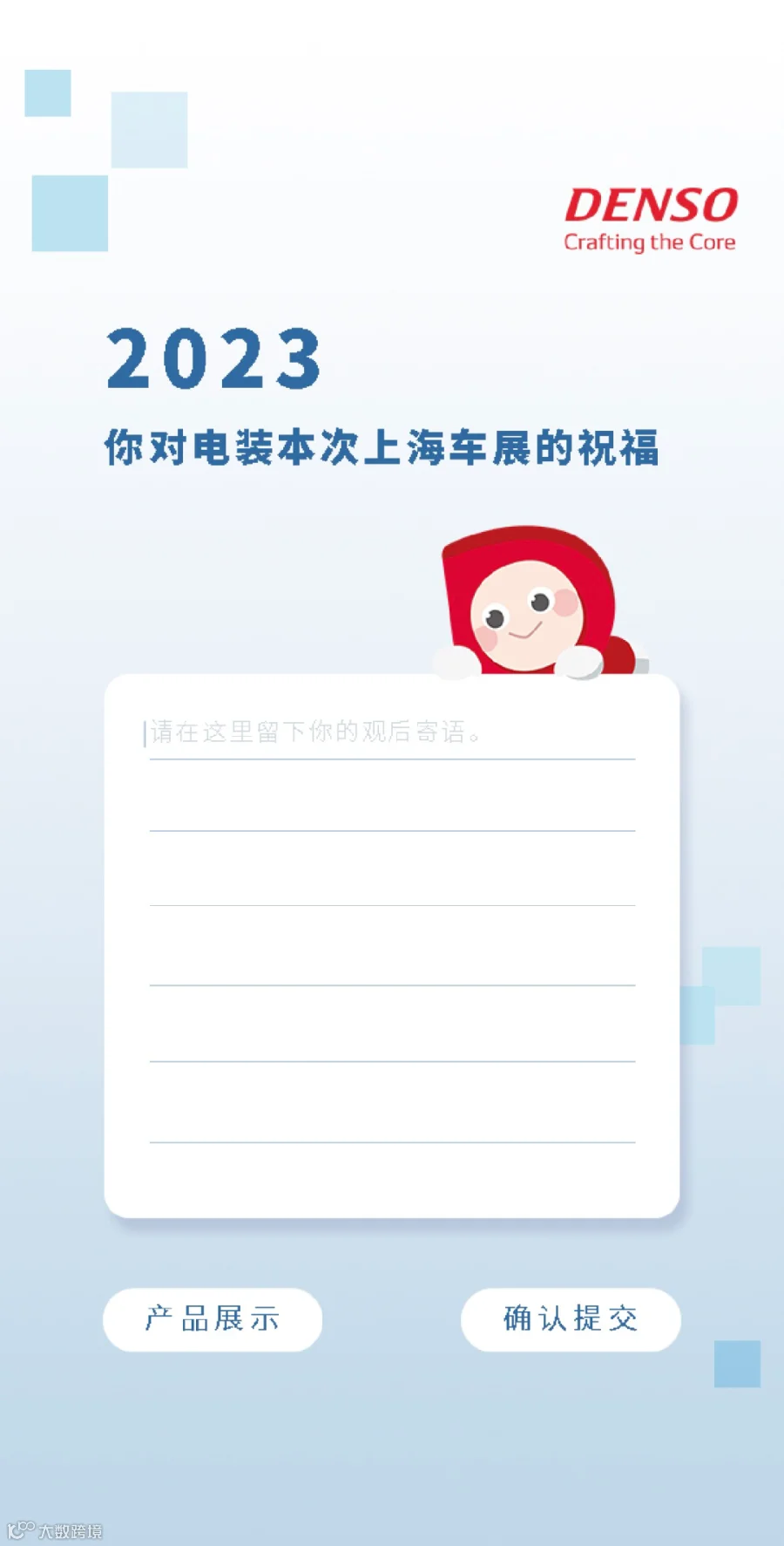 还有还有,在这春暖花开的好时节,电装小红人也很想听听你的观后感言或者任何想对我们说的话,欢迎在看展旅程结束后在留言页面给我们留言并提交,我们将会抽取5位幸运留言观众送出精美礼品一份哦,期待好运发生在你身上~
