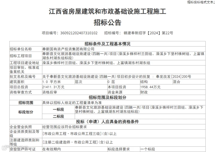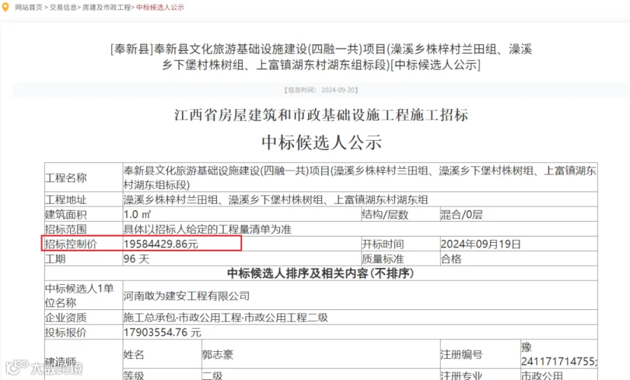 日前,江西省公共资原交易平台发布《奉新县文化旅游基础设施建设(四融一共)项目(耕香新村标段)项目中标侯选人公示》,中标金额1917万元,投标人数量7503家,通过资格审查的7499家。