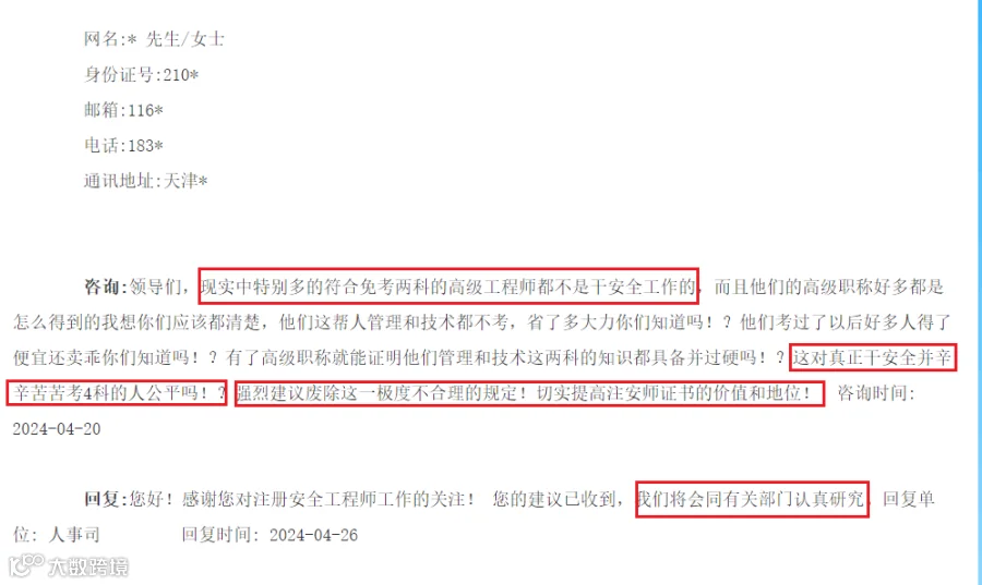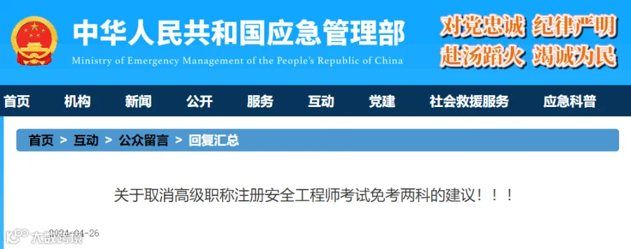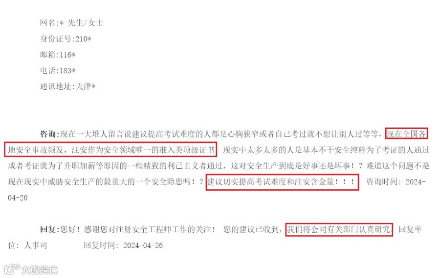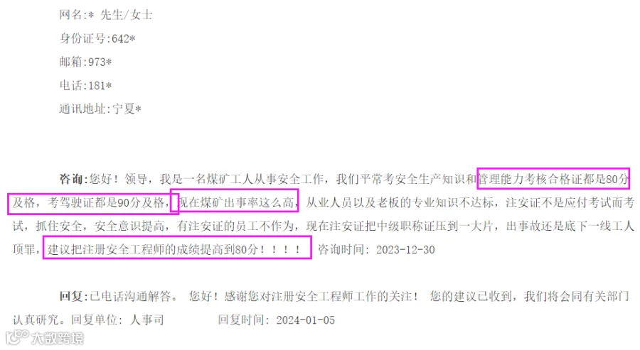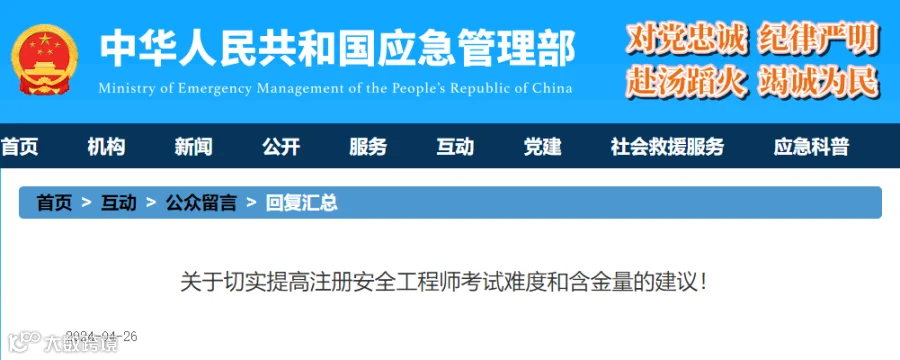 此前,某网友在应急管理部互动板块留言:建议把注册安全工程师的合格成绩提高至80分(标准是60分合格)。(下滑可查看留言详情)。