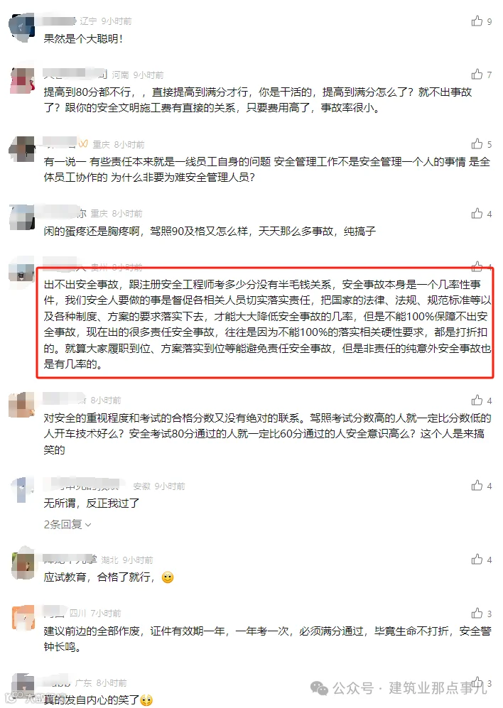 某网友在应急管理部互动板块留言:建议把注册安全工程师的合格成绩提高至80分(标准是60分合格)。