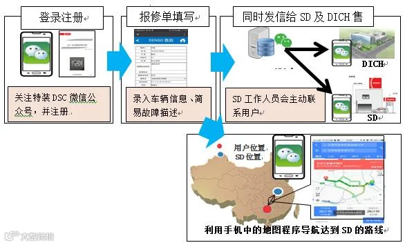 用户通过微信端就可向就近的电装服务站进行报修预约,方便快捷。DSC微信系统还会利用手机中的导航软件进行路径指引。