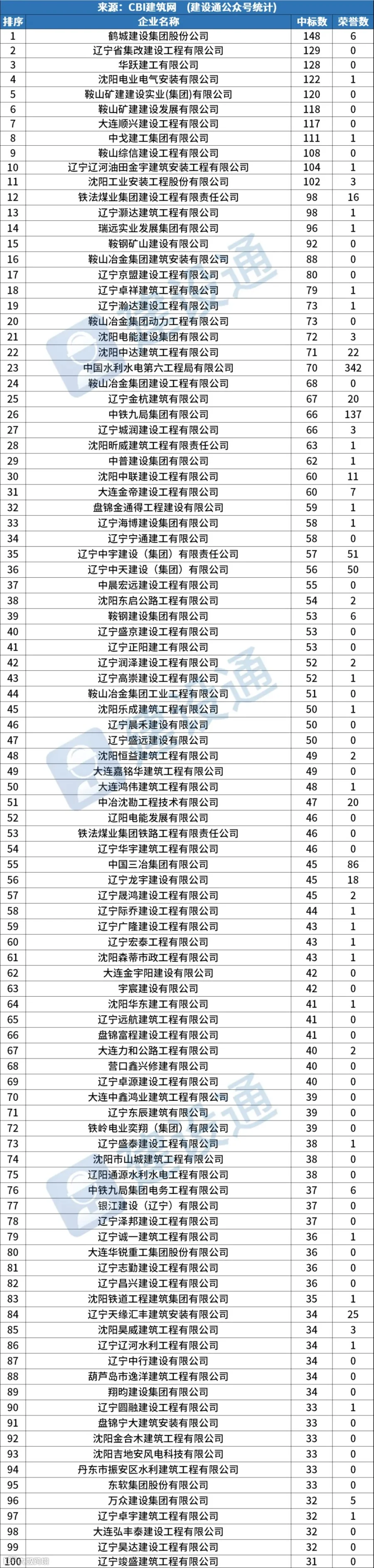 CBI建筑网综合报道在2023年,辽宁建筑施工企业中标数量达38825项,同比(与去年同期)上升8.88%。其中,鹤城建设集团股份公司、辽宁省集改建设工程有限公司、华跃建工有限公司分列中标数量排行榜前三位。
