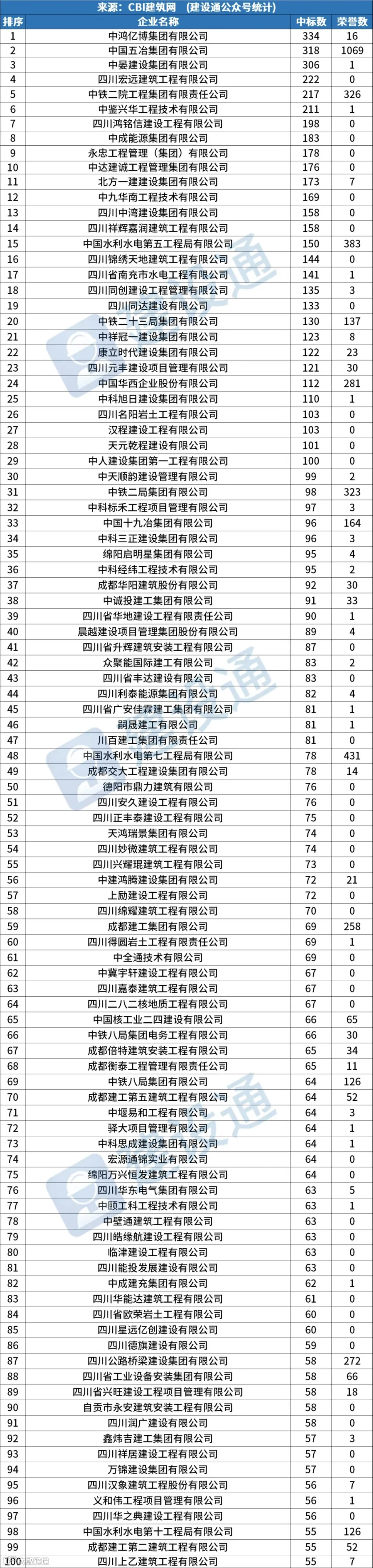 CBI建筑网综合报道:在2023年,四川建筑施工企业中标数量达91357项,同比(与去年同期)上升24.35%。其中,中鸿亿博集团有限公司、中国五冶集团有限公司、中晏建设集团有限公司分列中标数量排行榜前三位。