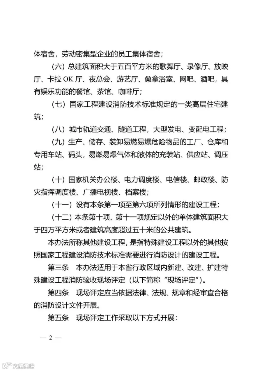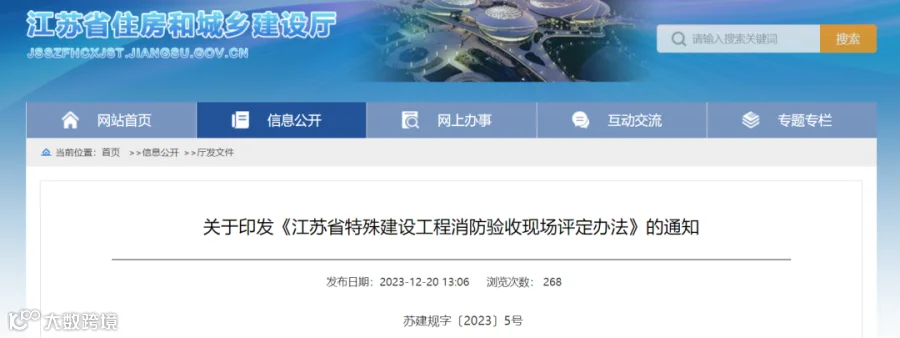 12月20日,江苏省住建厅印发《江苏省特殊建设工程消防验收现场评定办法》,自2024年2月1日起施行。