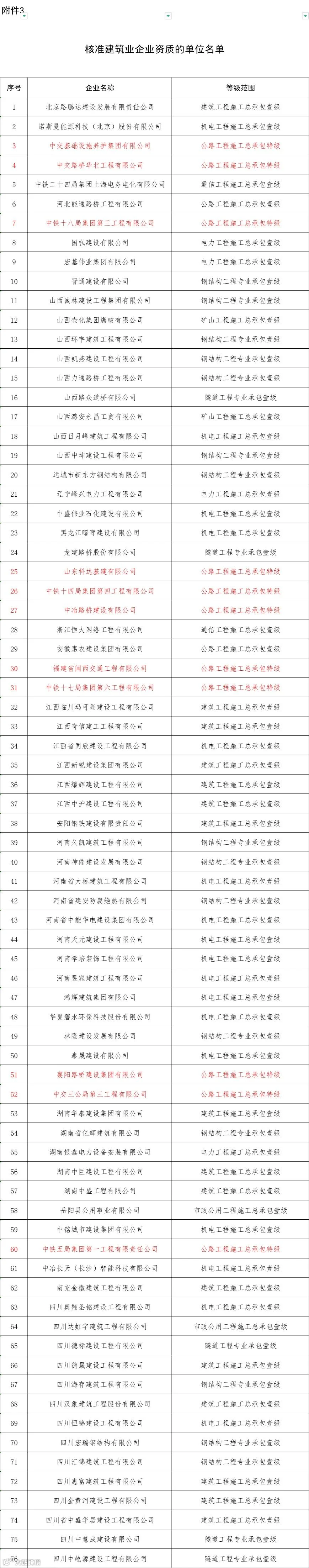 第四批全部名单:住建部第四批公告:5家企业成功“升特”!
