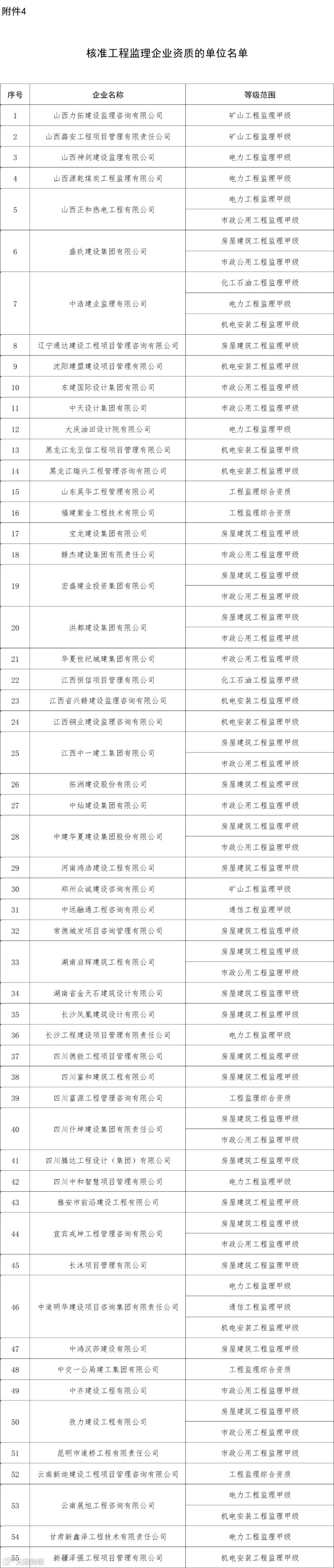 4.核准工程监理企业资质的单位名单