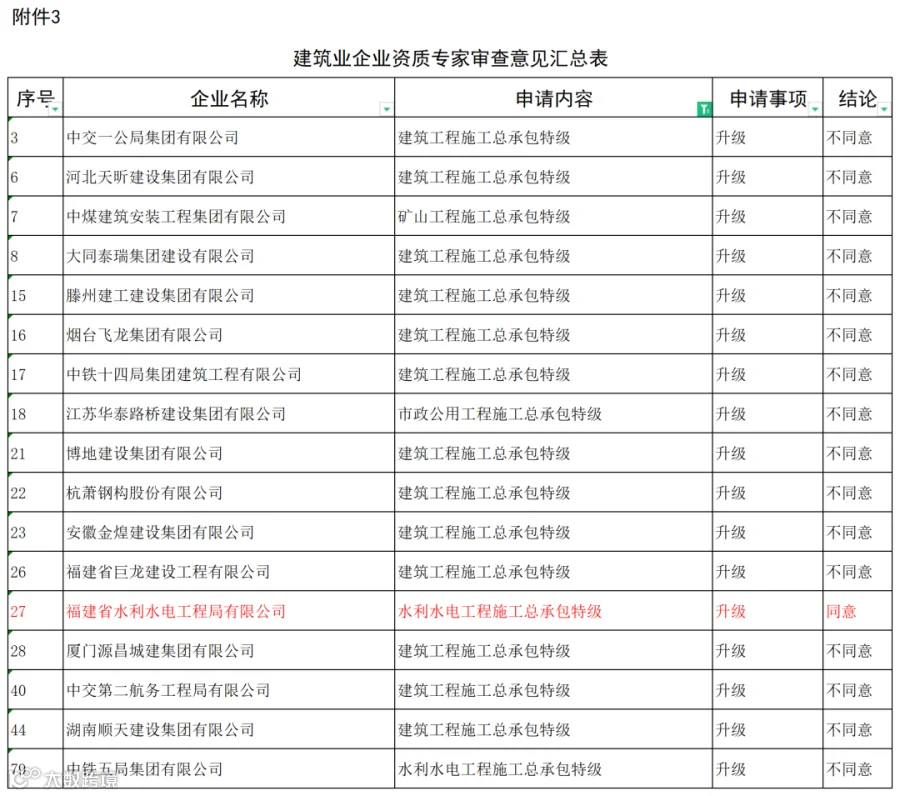 9月1日,住建部发布《关于建设工程企业资质专家审查意见的公示》(建办受理函〔2023〕15号)。17家申请升特,仅同意1家,其余16家不予通过。