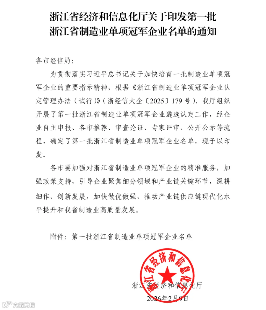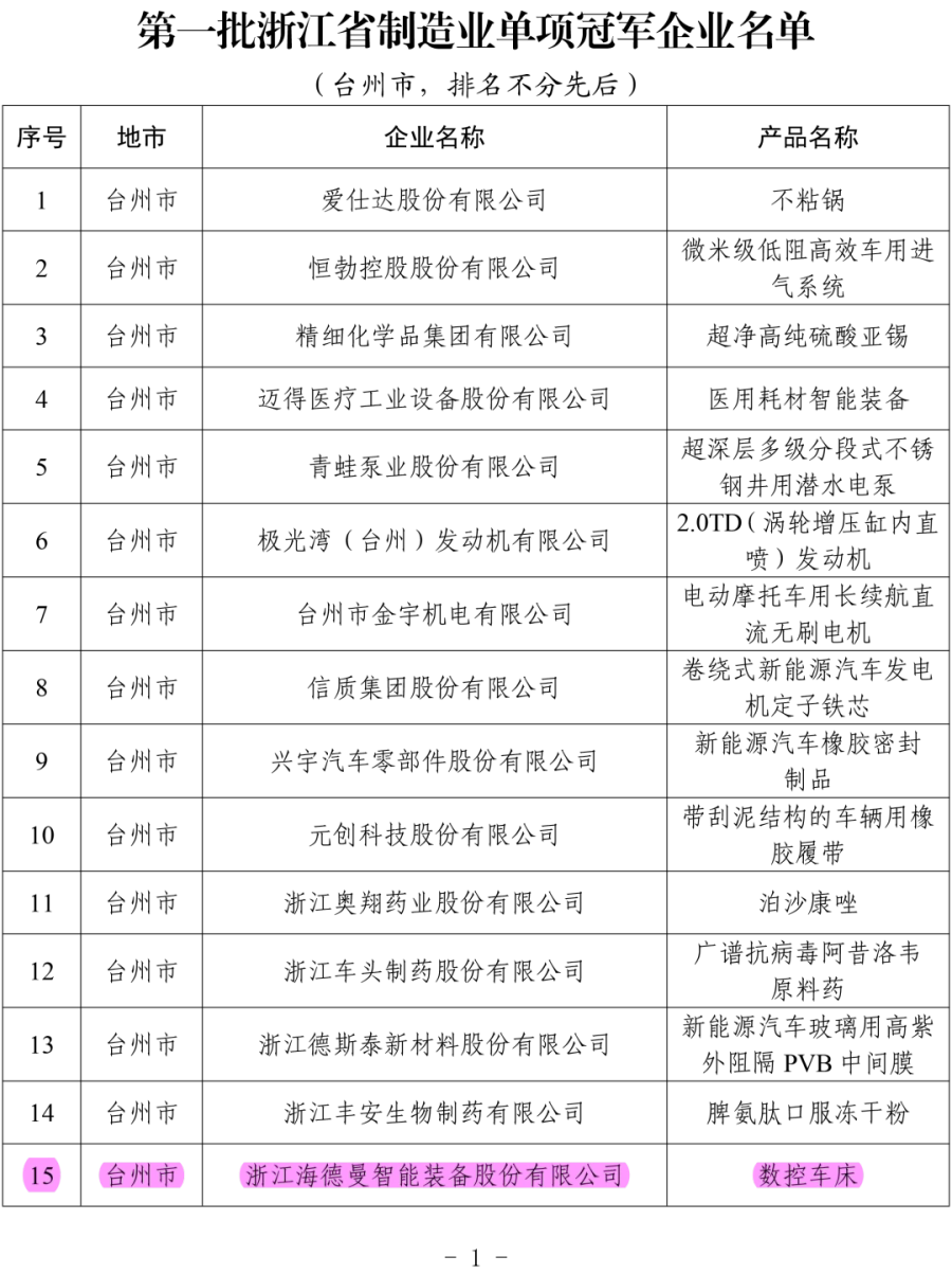 近日,浙江省经济和信息化厅正式印发《第一批浙江省制造业单项冠军企业名单》,海德曼成功入选。这是对公司长期深耕高端数控机床领域的充分肯定,也是对海德曼多年来坚持匠心制造与创新发展的高度认可,这份荣誉,为公司在高质量发展道路上注入了强劲动能。