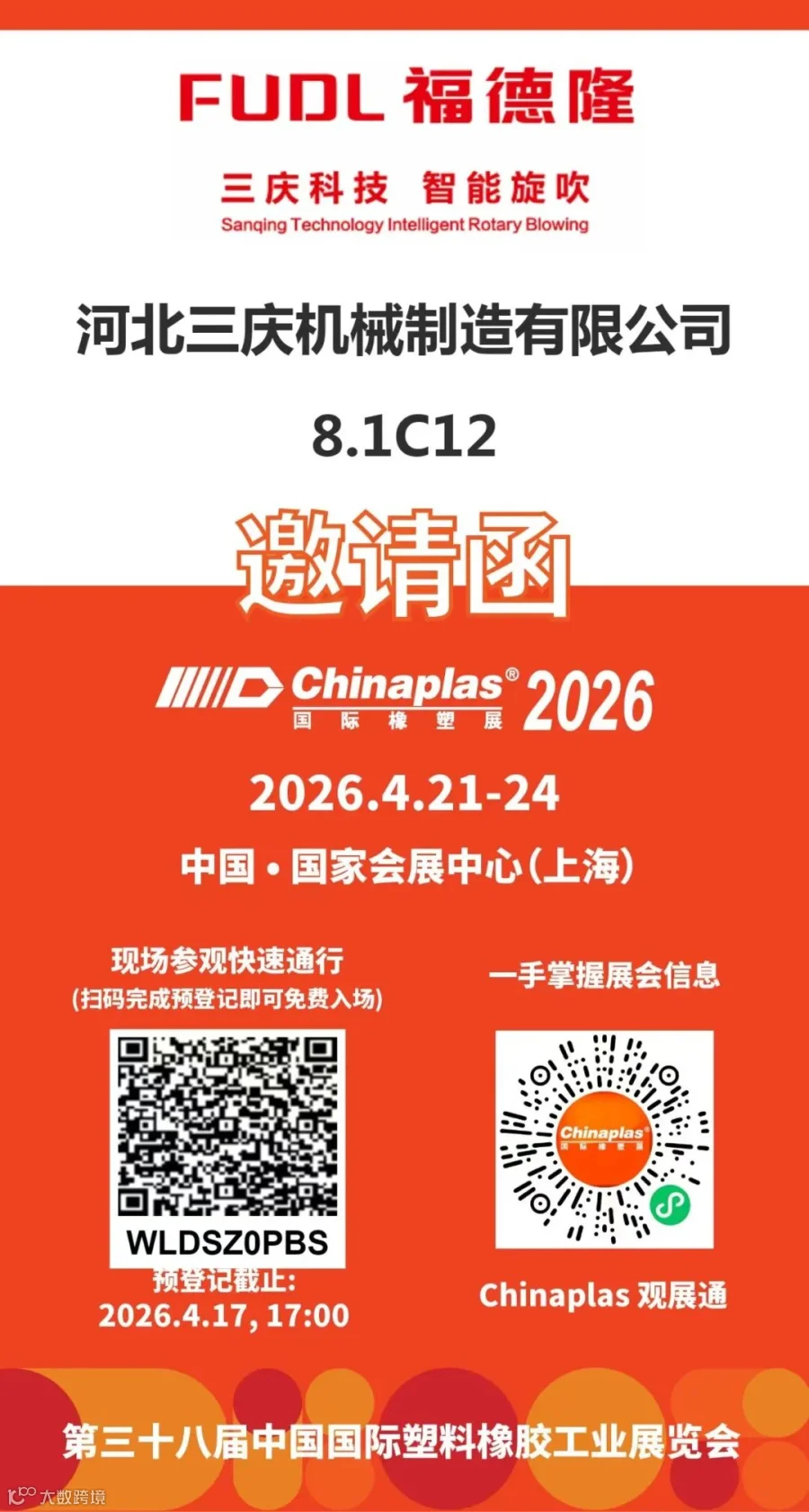 CHINAPLAS 国际橡塑展作为橡塑行业年度盛会,将于2026 年 4 月 21 日 —24 日在上海国家会展中心(虹桥)隆重举办。届时行业精英齐聚,共探橡塑产业新机遇、新趋势。三庆公司诚挚邀请您莅临8.1 馆 C12 展位,与我们面对面交流,共绘行业发展新蓝图!