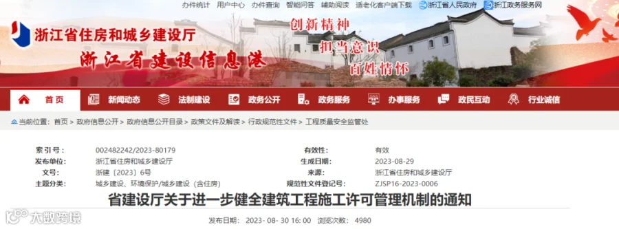 近日,浙江省住建厅发布《省建设厅关于进一步健全建筑工程施工许可管理机制的通知》。该文件于2023年9月30日开始实施。