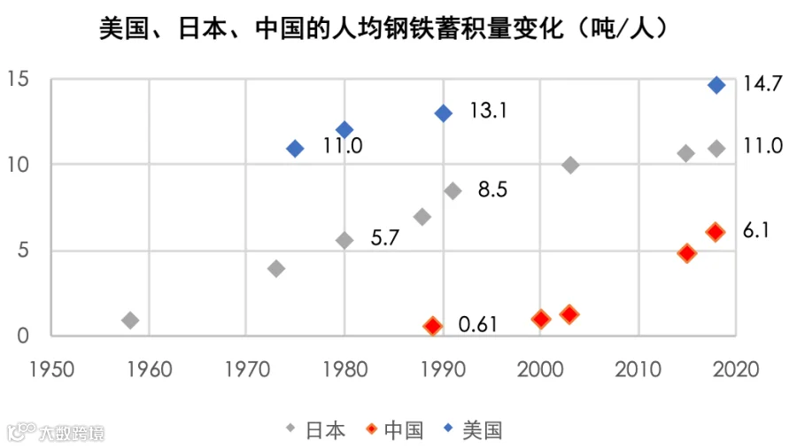 从钢铁制品存量看,日本的人均钢铁存量约为11吨,中国的人均存量约为6吨,按照中国现在的钢铁产量来推算,约10年内中国的钢铁存量就可以达到代表发达国家标准的日本的水平。