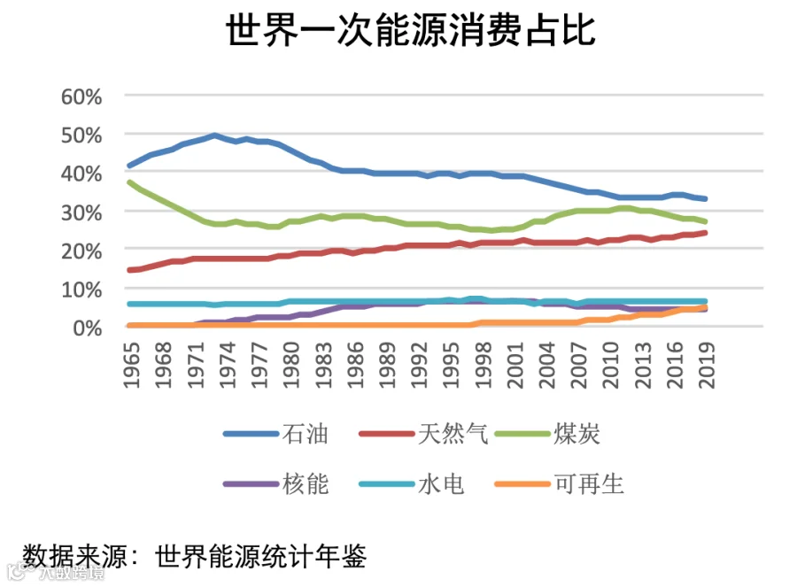 现在全球的能源格局中还是化石能源占主导。以2019年全球一次能源消费结构为例:石油、煤炭和天然气分别占33.1%、 27.0%和24.2%,光伏、风能和水电等可再生能源加总只有11.4%。