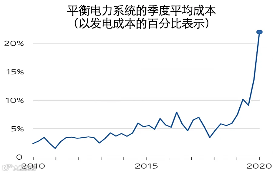 以英国的经验为例,2010年以前英国平衡电力系统的成本一般占整个发电成本的5%以内,而随着近年来英国能源结构中新能源占比的提高,平衡成本在2020年升到了发电成本的20%左右。