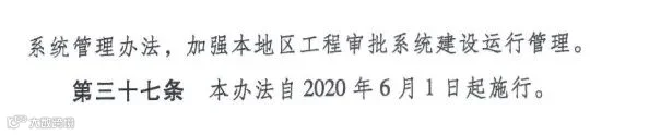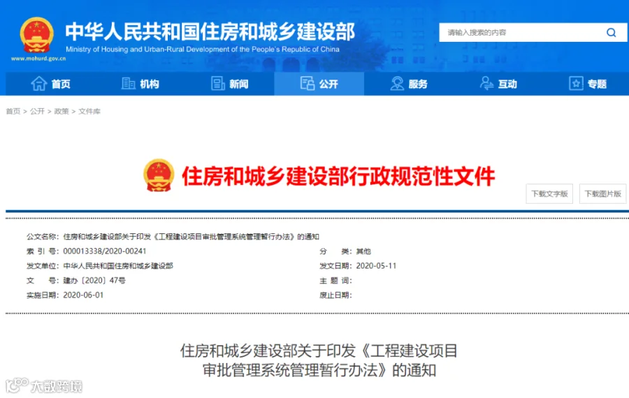 2020年5月,住房和城乡建设部印发《工程建设项目审批管理系统管理暂行办法》(建办〔2020〕47号),2020年6月1日起施行。