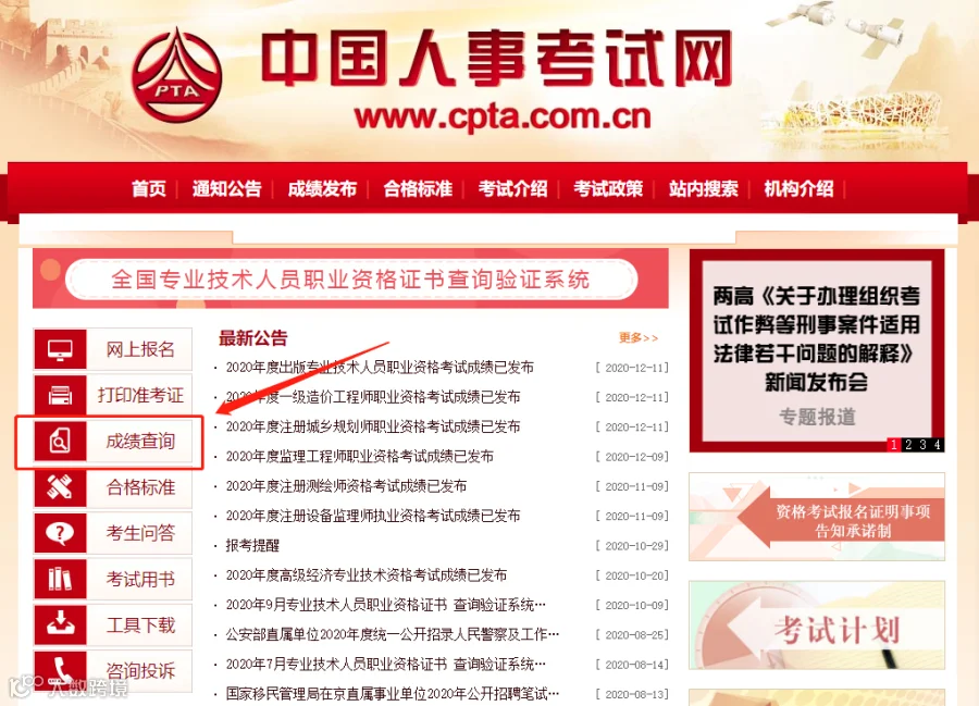 1、登录中国人事考试网(www.cpta.com.cn),点击成绩查询。