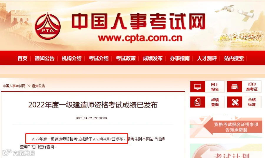 中国人事考试网发布2022年一级建造师成绩于4月7日开始查分,以下为具体公告内容: