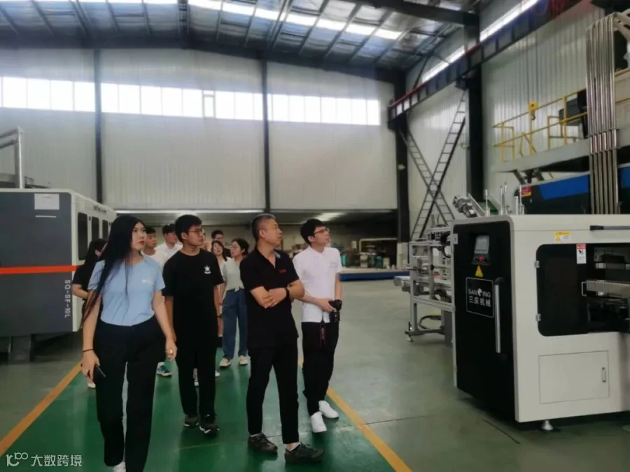 在同学们下车间时,对三庆机械的产品有了更深一步的认识和了解,尤其是我司现热销机型--大六模高速旋转吹塑机,针对不同专业学术领域,同学们从机械、环保、自动化等方面展开了积极的讨论。