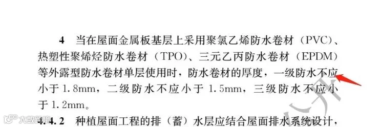 通用规范正式版本规定,金属屋面选用高分子防水卷材三兄弟,PVC、EPDM、TPO等外露型防水卷材单层使用时,一级防水厚度不应小于1.8mm,二级防水厚度不应小于1.5mm。其要求与原有单层屋面防水规程相比,厚度增加,要求严格。