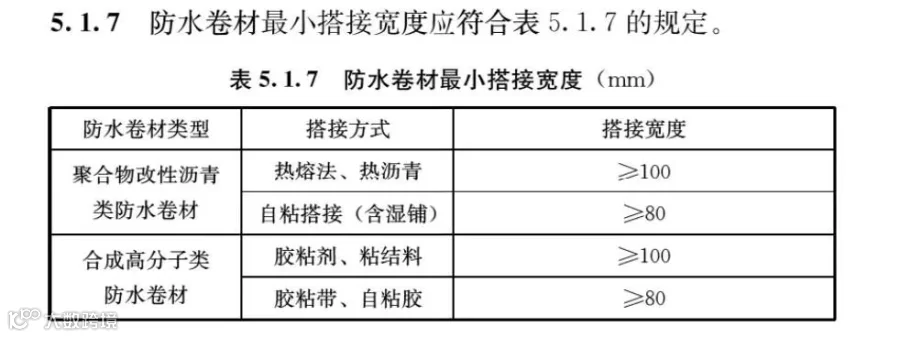 比如GB50108-2008规定高分子自粘胶膜防水卷材自粘胶搭接时,搭接宽度≥70mm,用胶粘带搭接时,搭接宽度≥80mm。通过规范正式版规定,合成高分子类防水卷材胶粘带和自粘胶 搭接宽度≥80mm,比以前要求更高。