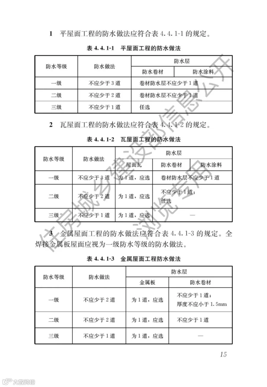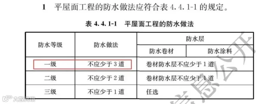 而正式版明确指出,屋面防水等级为一级时,防水做法不应少于3道,防水层的卷材防水层不应少于1道。二级防水,不应少于2道,卷材防水层不应少于1道。