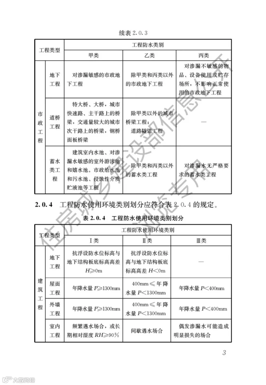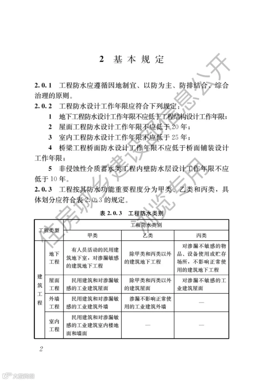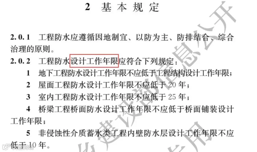 地下工程防水设计工作年限直接与结构主体同寿命,屋面工程工作年限≥20年,让人想起GB50693-2011《坡屋面工程技术规范》中的一级防水设计使用年限要求,拔高了标准。给老百姓提升信心。