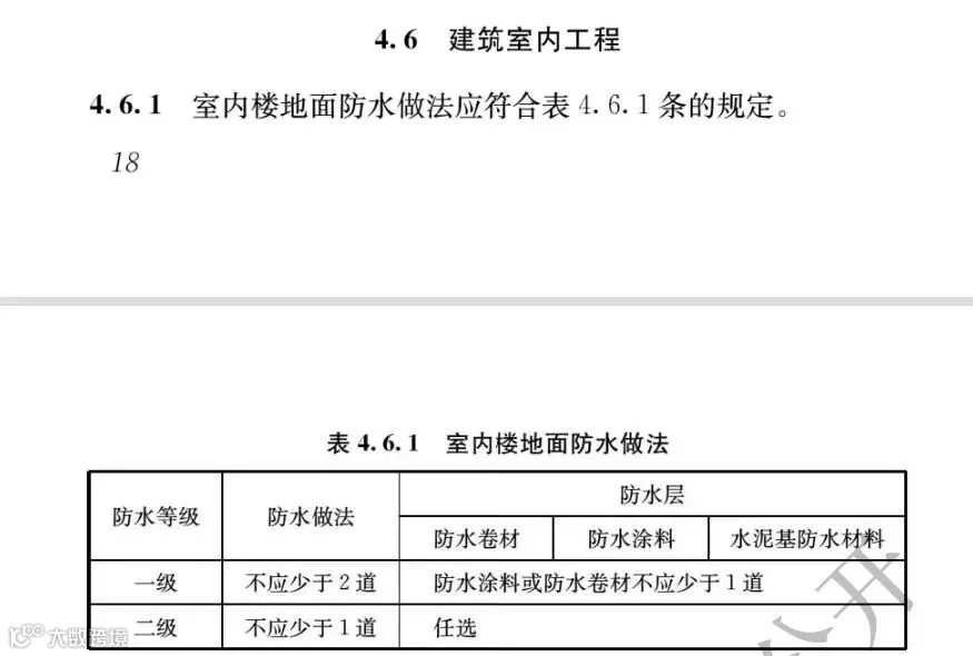 当防水等级为一级时,防水做法不应少于2道。其防水涂料或防水卷材不应少于1道。要知道,以前带有地暖的用水楼地面才做二道,现在其防水要求整体拔高。