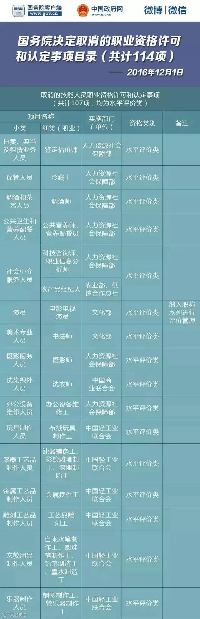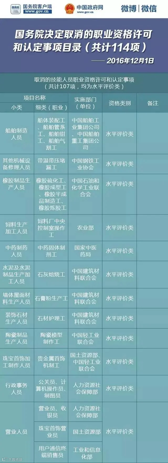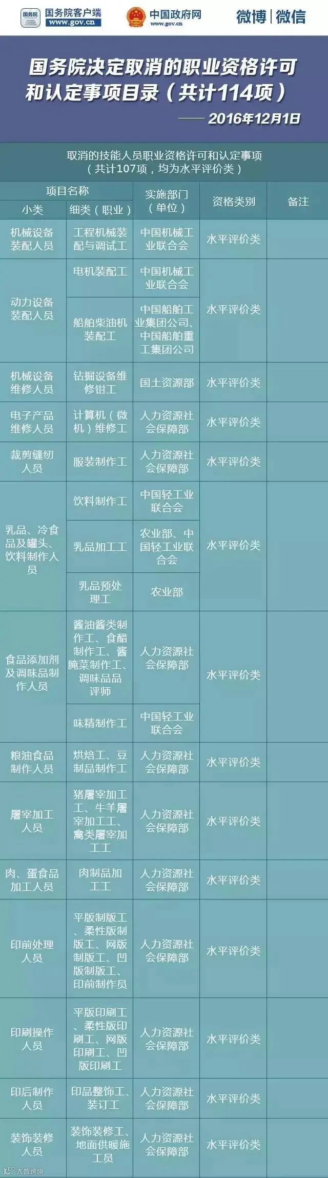 第七批取消的职业资格许可和认定事项目录(共计114项)