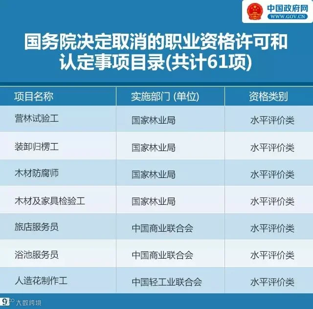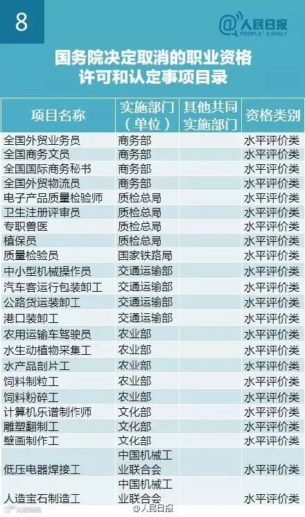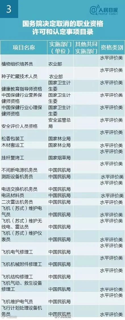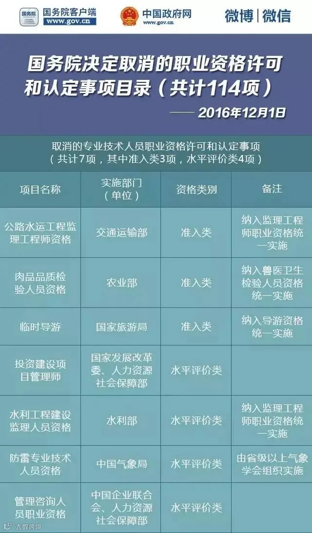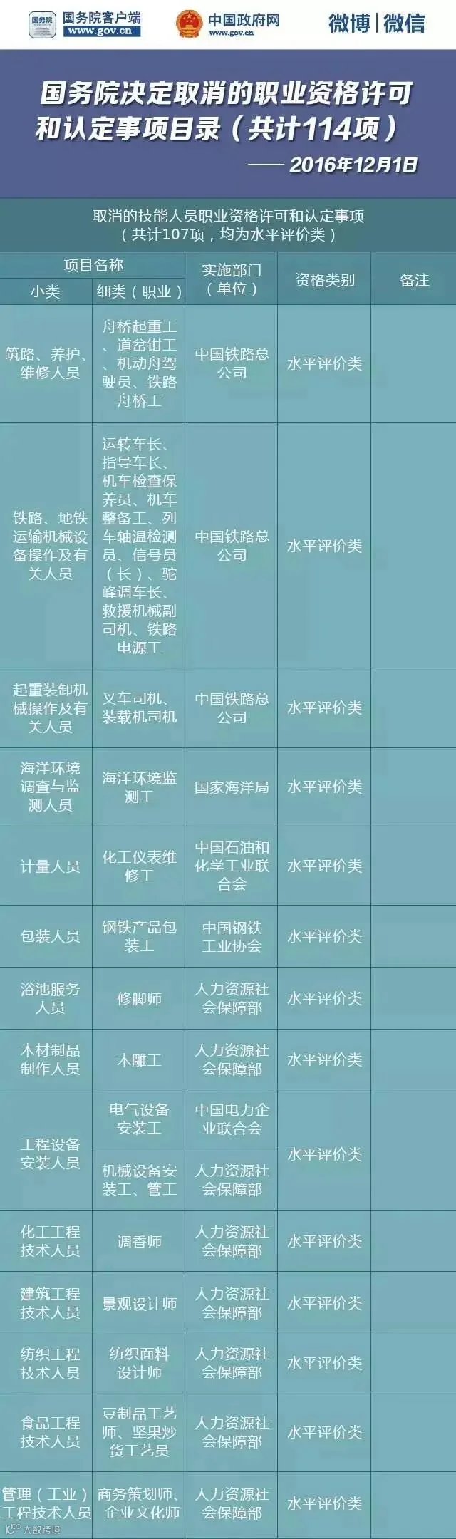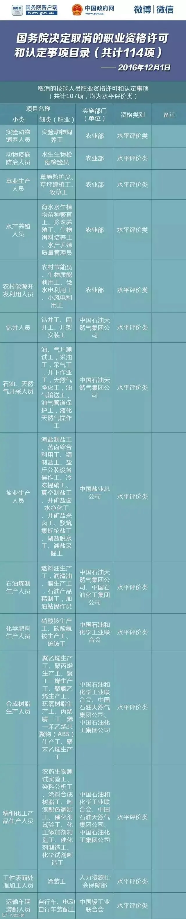 第七批取消的职业资格许可和认定事项目录(共计114项)