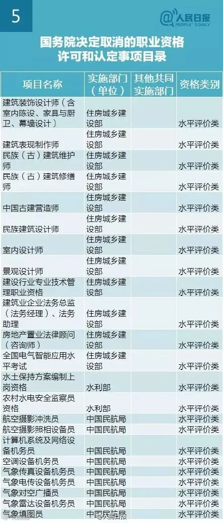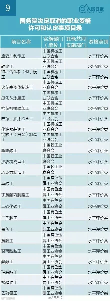 一、取消的专业技术人员职业资格许可和认定事项(共计9项,其中准入类8项,水平评价类1项)