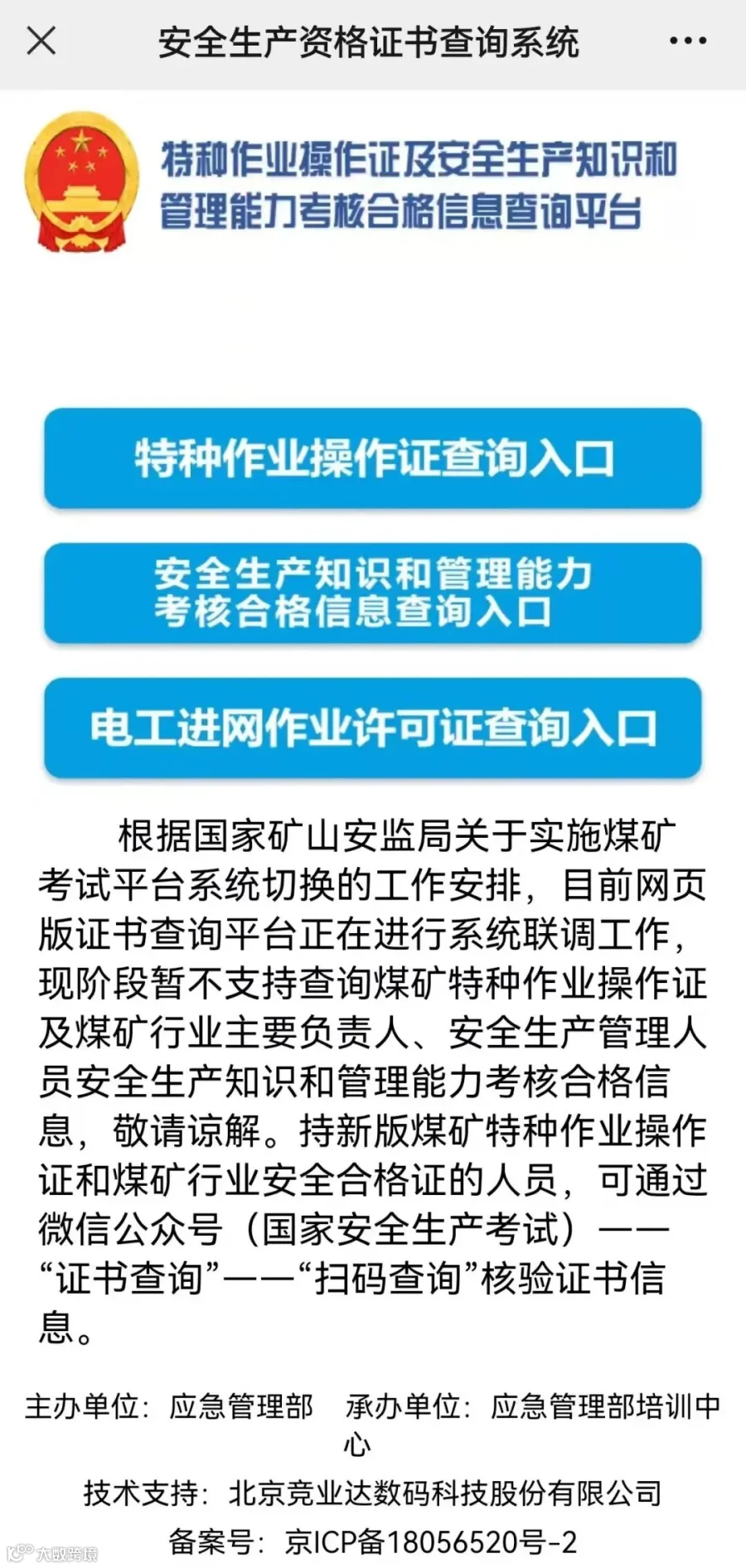 2、找到“特种作业操作证及安全生产知识和管理能力考核合格信息查询”,点击进入;