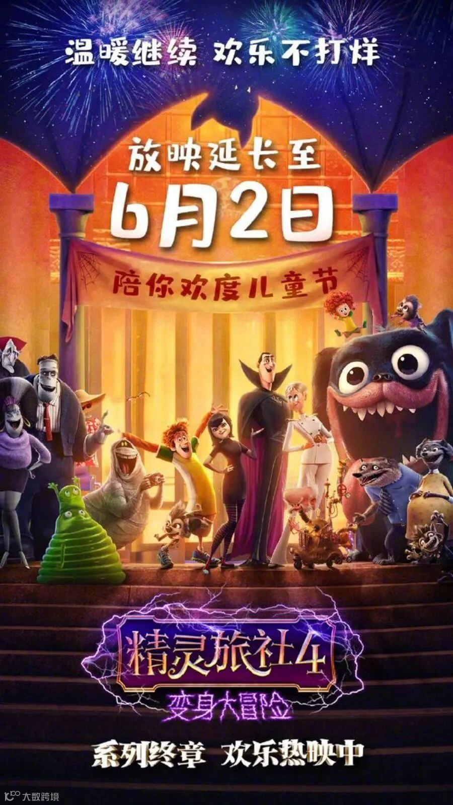 由詹妮弗·克鲁斯卡和德里克·德莱蒙联合执导的动画电影《精灵旅社4:变身大冒险》于4月3日在中国大陆上映,目前宣布放映将延长至6月2日。作为《精灵旅社》系列的最终篇章,《精灵旅社4:变身大冒险》讲述了精灵家族开启人间冒险的故事。