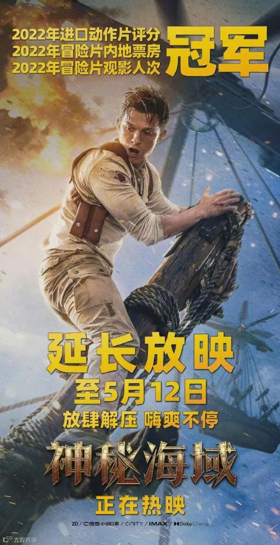 除了以上三部影片之外,由荷兰弟汤姆·赫兰德、马克·沃尔伯格联袂主演《神秘海域》也宣布延长放映至5月12日。《神秘海域》改编自同名的游戏,讲述了一场寻宝的冒险故事。