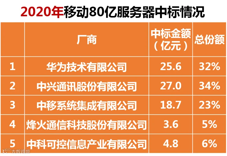 2020年及以前,中移动服务器集采,一直都是华为、中兴获得大部分份额。以2020年为例: