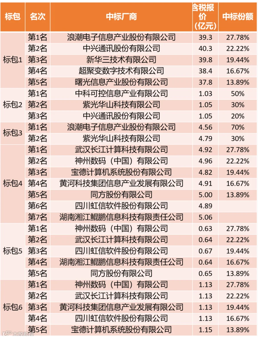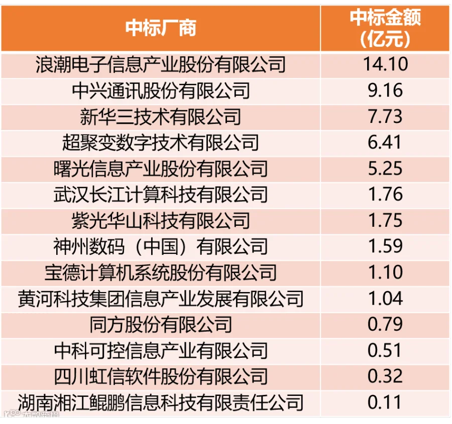 浪潮信息获得最大份额,中兴、新华三、超聚变、曙光信息分获2-5名。
