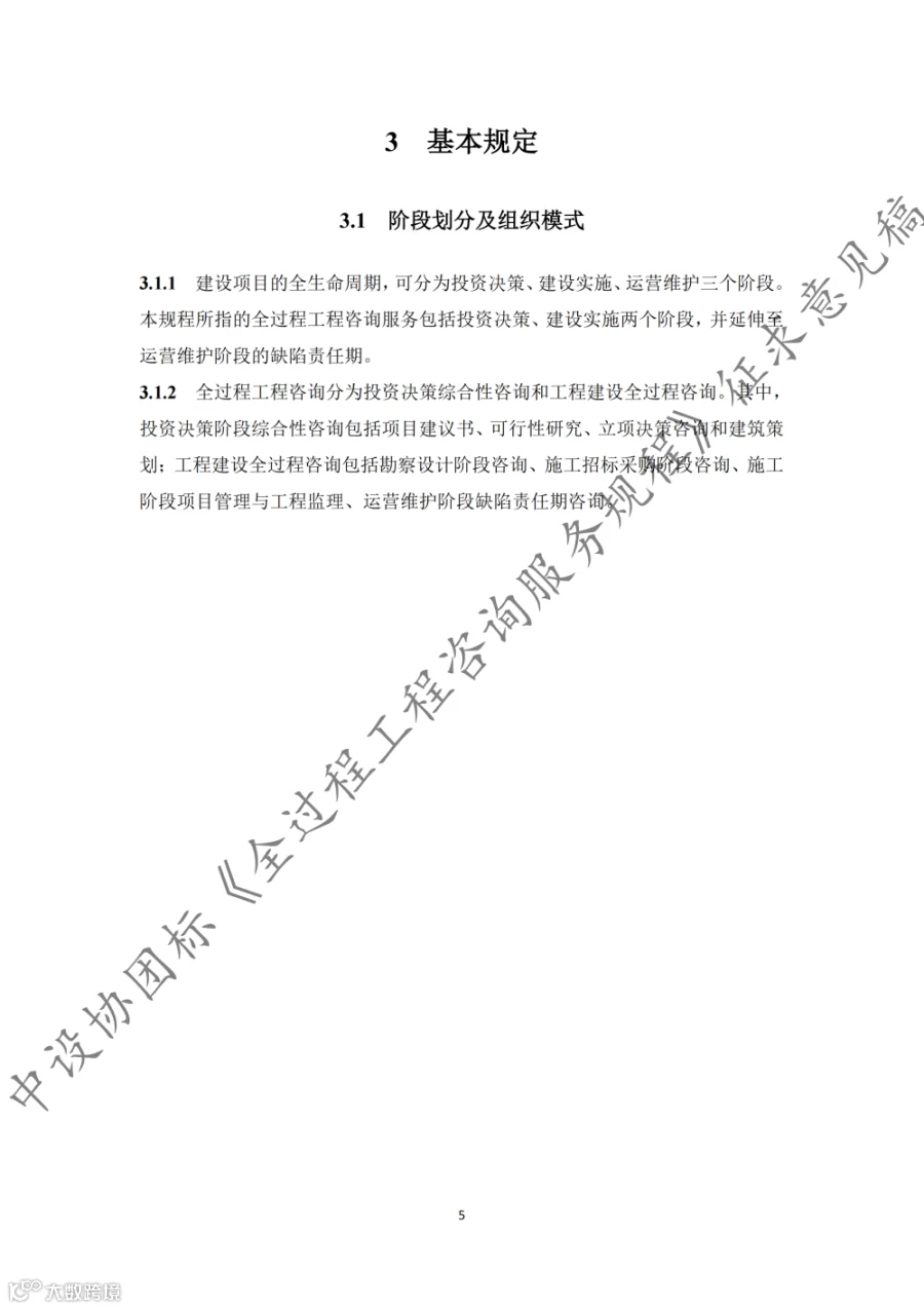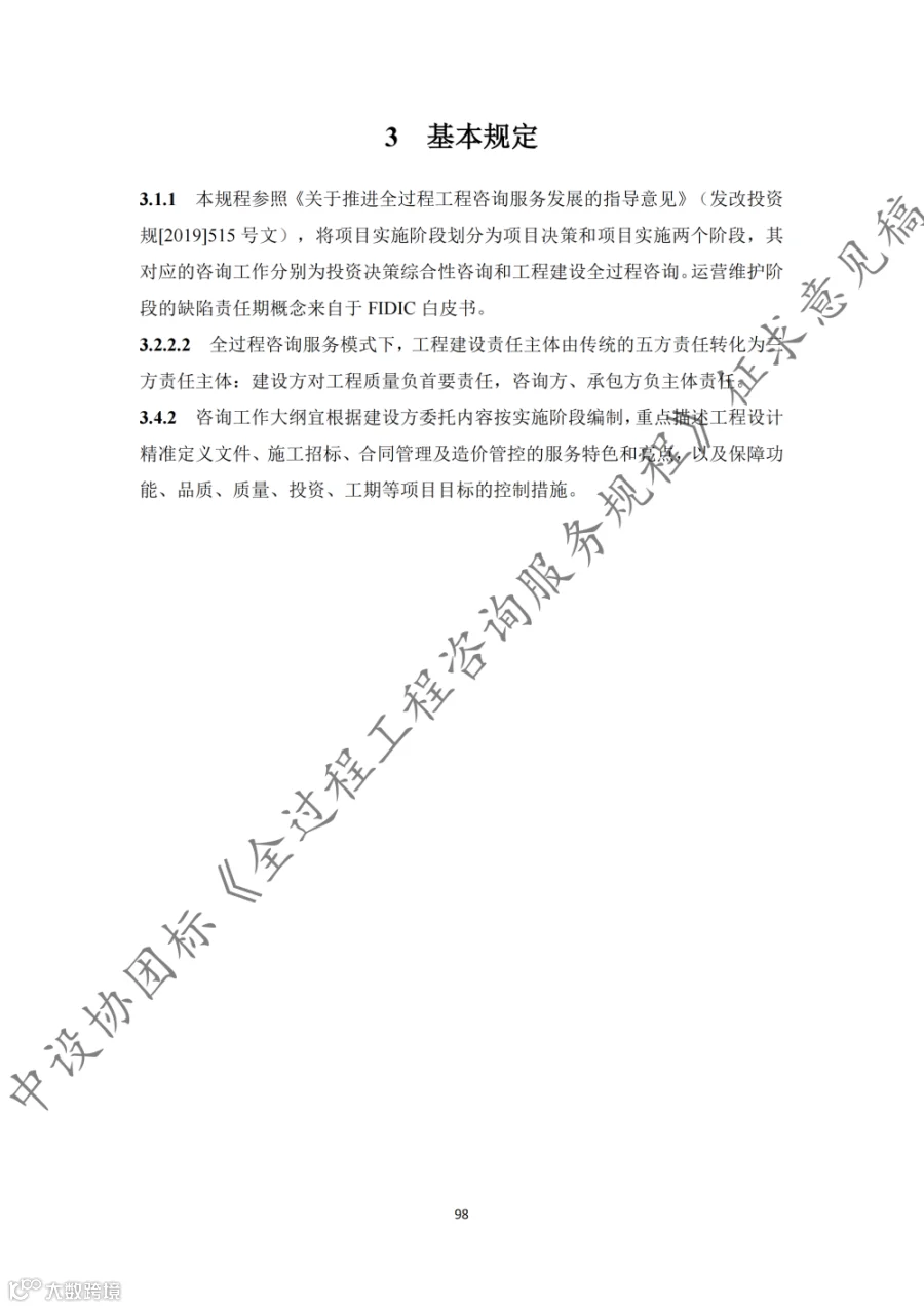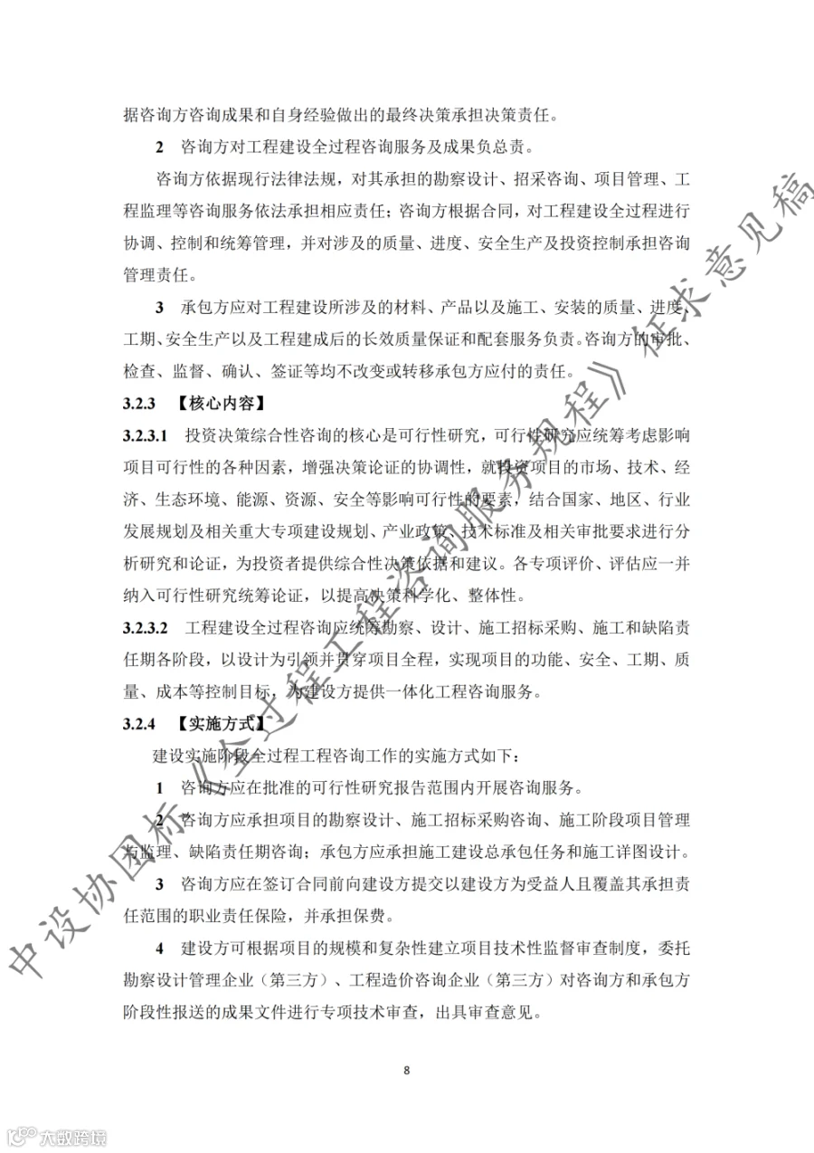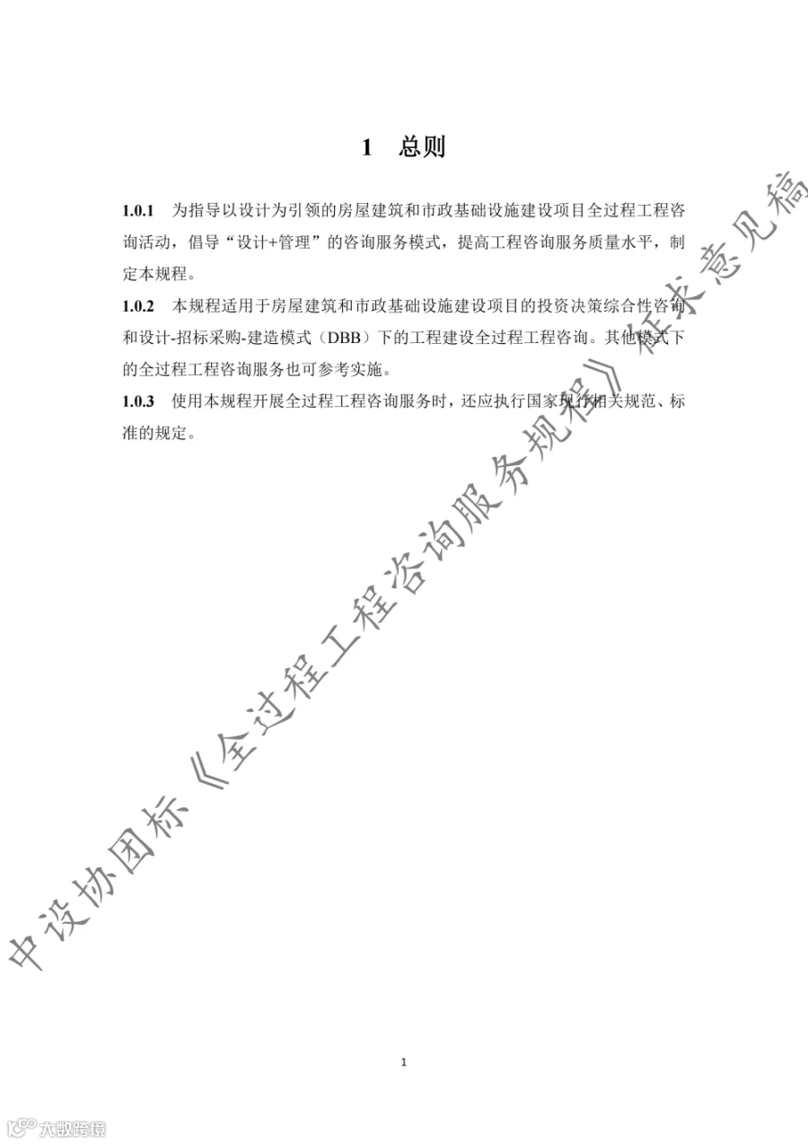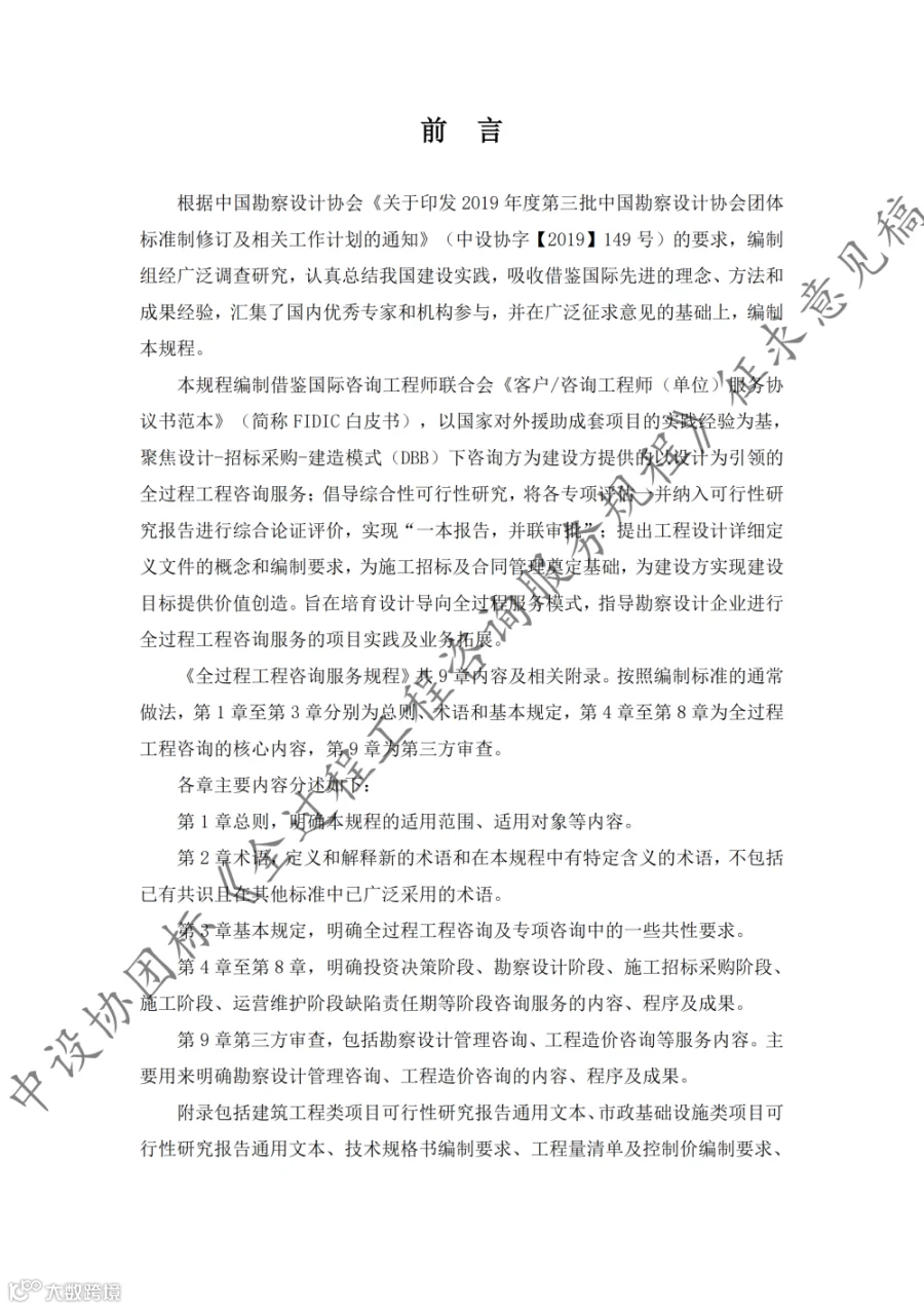 据悉,《规程》共9章内容,第1章至第3章分别为总则、术语和基本规定,第4章至第8章为全过程工程咨询的核心内容,第9章为第三方审查。《规程》适用于房屋建筑和市政基础设施建设项目的投资决策综合性咨询和设计-招标采购-建造模式(DBB)下的工程建设全过程工程咨询,其他模式下的全过程工程咨询服务也可参考实施。