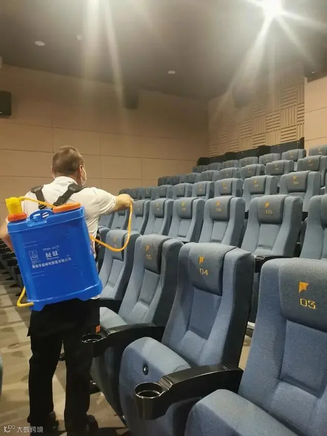 ▲正在对影厅进行消毒防疫工作的潇湘院线