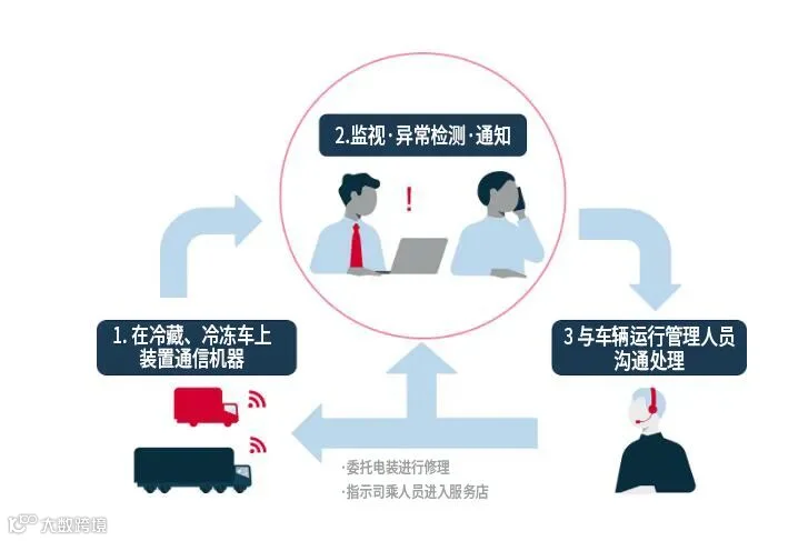 电装的D-FAMS服务就是为改善这一问题而开发的。它可以远程监控管理装载在卡车上的冷冻机,替代司乘人员来监控车辆的故障或异常、判断合适的保养时间,并发出通知。