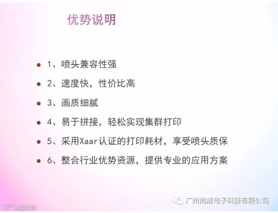 广州旭成一直致力于打印机的研发和应用。主要产品有写真机、喷绘机、数码印花机、平板UV机等,广泛应用于广告标识、数码印染、包装印刷等多个行业。其自主研发的极光品牌下的各款打印机设备在全球多个国家及多个行业取得了不凡的口碑,极光打印设备以其卓越的性能和超高的稳定性赢得了广大客户的一致认可。为广大客户提供最智能化和最现代化的完整喷印解决方案。