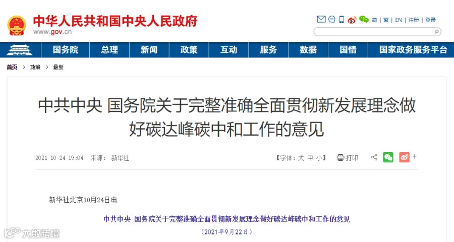 1、中共中央 国务院关于完整准确全面贯彻新发展理念做好碳达峰碳中和工作的意见