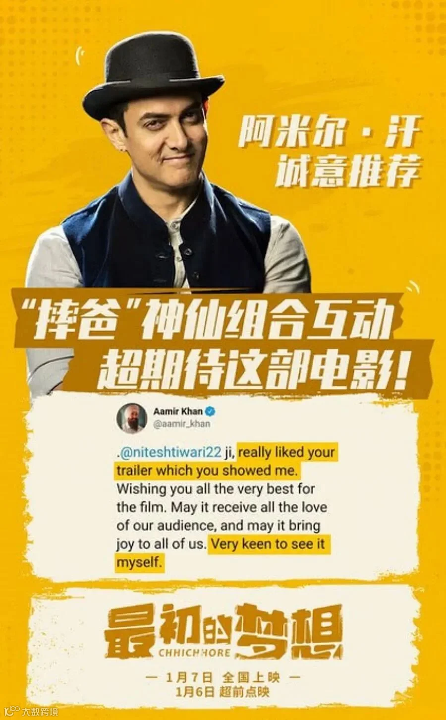 《摔跤吧!爸爸》导演涅提·蒂瓦里作品《最初的梦想》1月6日点映,1月7日全国上映。导演涅提·蒂瓦里用中文给中国观众带来了视频问候,同时表达了对影片上映的期待。该片在印度上映时就被观众和媒体称为“年度最佳印度电影”,印度国宝级演员阿米尔·汗也发文支持这部影片。在此前的点映中,首批观众观影后好评如潮,片中涉及到的教育议题更是引起了网友的激烈讨论。