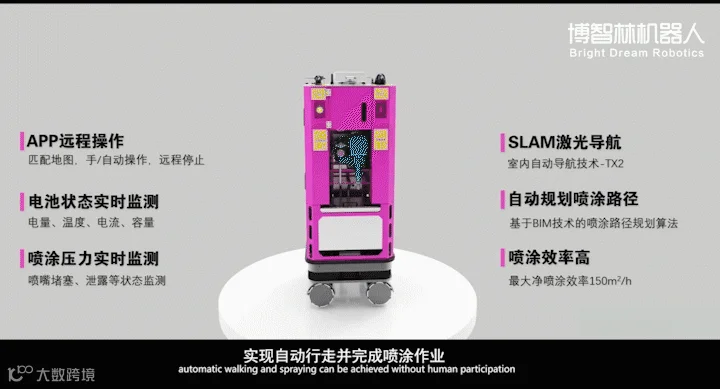 博智林地下车库喷涂产品系列(2.4米地下车库喷涂机器人、4.5米地下车库喷涂机器人)主要用于地下车库的墙面、立柱和天花等建筑毛坯表面的腻子以及乳胶漆自动喷涂作业,同时也适用于办公楼、商场、学校、医院、工厂等高层高场景下的腻子和乳胶漆自动喷涂作业。