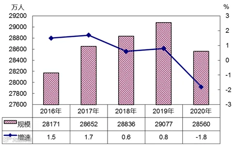 近年来,越来越多的年轻人已不愿像父辈那样进工地,转而选择时间更自由、收入也不低的外卖、快递等行业。年轻劳动力流失的同时,工人老龄化也在加剧。国家统计局《2020年农民工监测调查报告》显示,2020年全国农民工总量28560万人,比上年减少517万人,下降1.8%。其中,从事建筑业的农民工比重为18.3%,比上年下降0.4个百分点。