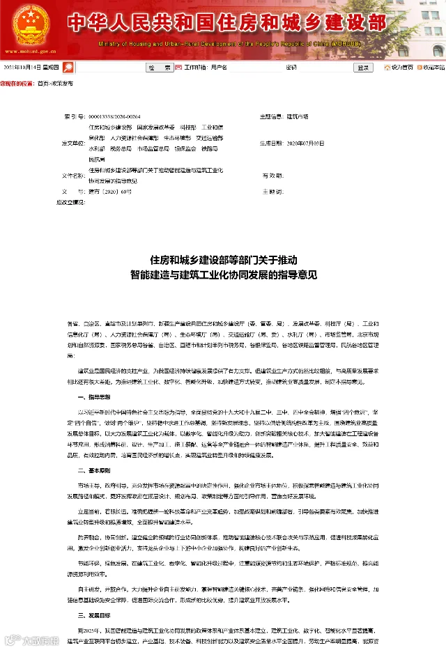 为推进建筑工业化、数字化、智能化升级,加快建造方式转变,推动建筑业高质量发展,住房和城乡建设部等部门在今年7月发布了《关于推动智能建造与建筑工业化协同发展的指导意见》(以下简称《意见》)。《意见》提出,围绕建筑业高质量发展总体目标,以大力发展建筑工业化为载体,以数字化、智能化升级为动力,创新突破相关核心技术,加大智能建造在工程建设各环节应用,实现建筑业转型升级和持续健康发展。