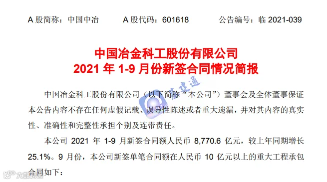 昨日,中国冶金科工股份有限公司(简称“中国中冶”)2021 年 1-9 月新签合同额情况简报发布,公告显示,中国中冶 1-9 月份累计新签合同额人民币 8770.6 亿元,同比增长率 25.1%,已完成年度新签合同额目标的 73.1%。