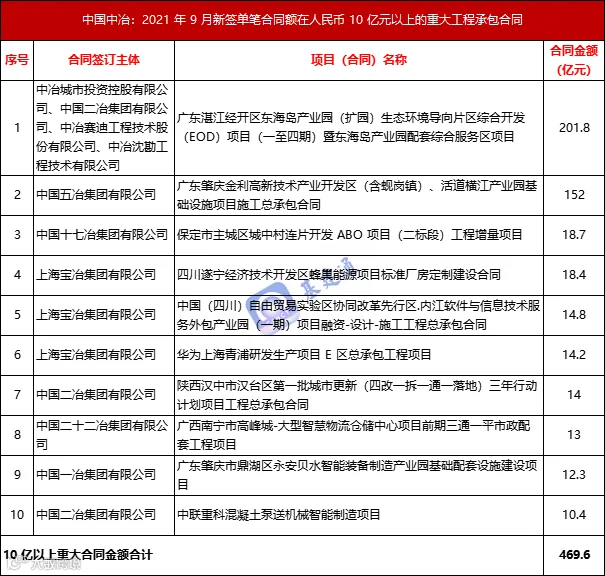 除过上面的那个项目,中国中冶集团在广东省还签订了另外 2 项重大工程,使得广东区域成为 9 月份集团拿单强省,重大项目签约额达 366 亿元。两个百亿大单均位于该省份。