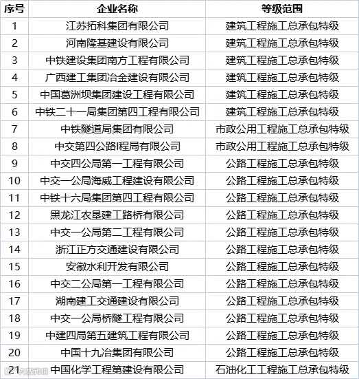 2021年1月至今,住建部公告通过4批次建筑业企业资质审查,新增加特级资质项仅有21个: