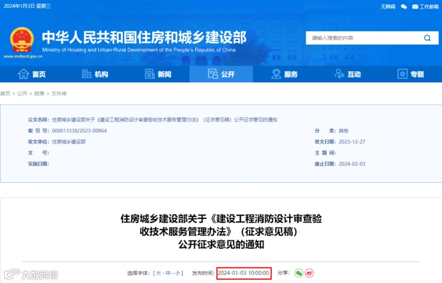 为加强建设工程消防设计审查验收技术服务活动管理,规范市场行为,维护公共安全,住房城乡建设部研究起草了《建设工程消防设计审查验收技术服务管理办法》(征求意见稿),现向社会公开征求意见。公众可通过以下途径和方式提出反馈意见: